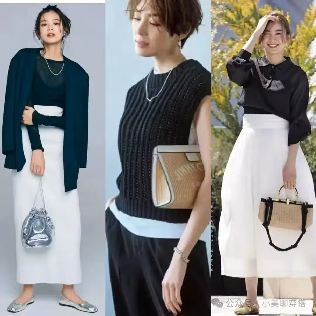 夏天可以選擇一件黑色的針織衫,搭配白色直筒裙,清爽乾淨的配色擺脫了油膩感,反而顯得人更加年輕有活力,而且知性雅致,高級感滿滿。