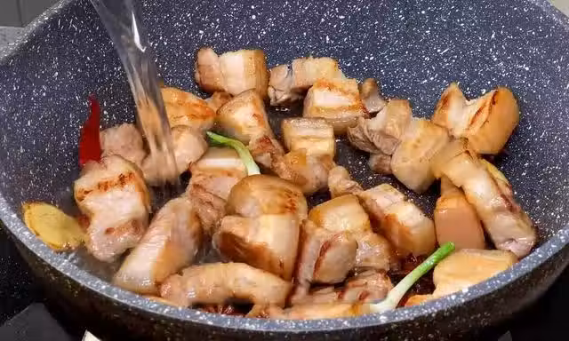4、炒出香料的香味後,倒入清水,一定要淹沒五花肉,同時再放入適量的生抽、老抽、冰糖、料酒,翻動下蓋入鍋蓋用小火煮40分鐘左右。