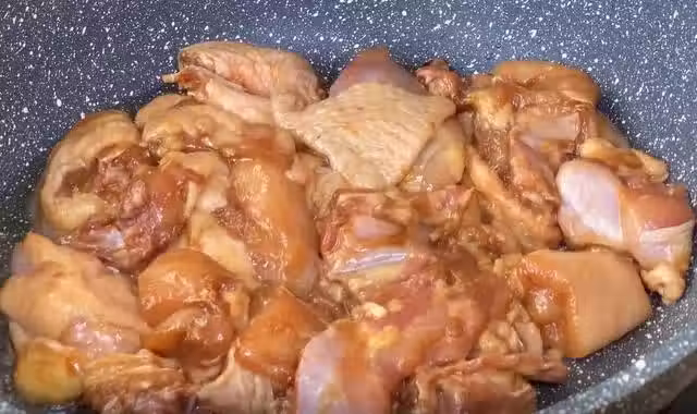2、起鍋倒入少許油,將腌制好的雞肉倒入鍋中,將兩面稍稍的煎一下,煎至兩面金黃之後,再翻炒一下,炒至八分熟左右,就可以將它盛出來。