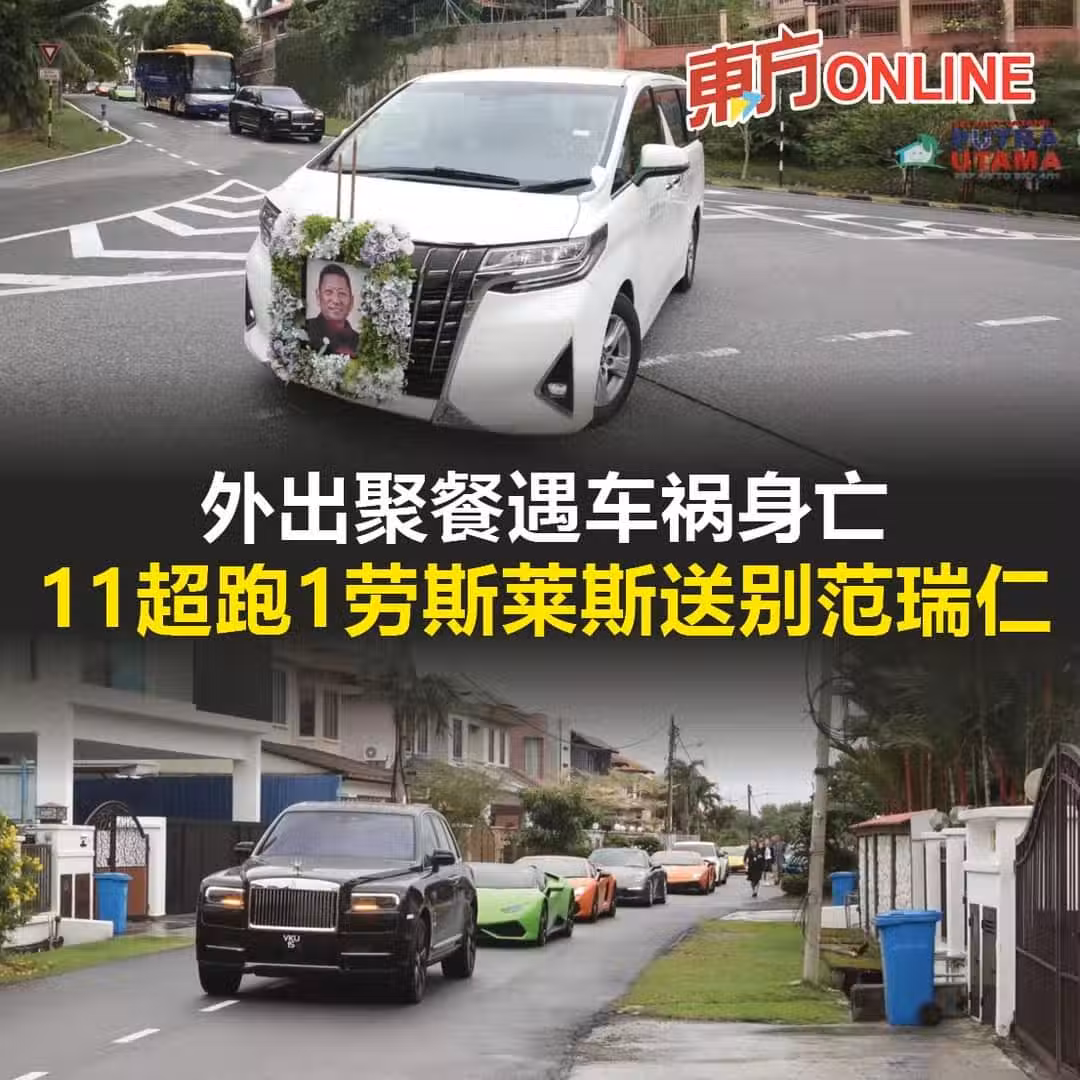 一支由新馬超跑俱樂部組成的豪車隊伍,今早陸續從各地趕赴喪禮,為范瑞仁送行。該豪車隊伍包括一輛勞斯萊斯、藍寶堅尼(5輛)、法拉利(2輛)、保時捷(2輛)、馬賽地(1輛)以及一輛日產GTR跑車。