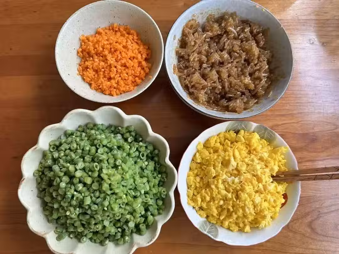 3、將冷卻的雞蛋、炒軟的胡蘿蔔丁、拌好的粉條以及任何你喜歡的配料(如蔥花、木耳碎等)一同放入大盆中。隨後,根據個人口味加入適量的五香粉提香、蚝油增鮮、鹽調味、再滴入幾滴香油或融化的豬油增加滑潤感,所有食材與調料充分拌勻,直至餡料色澤誘人,香氣四溢。