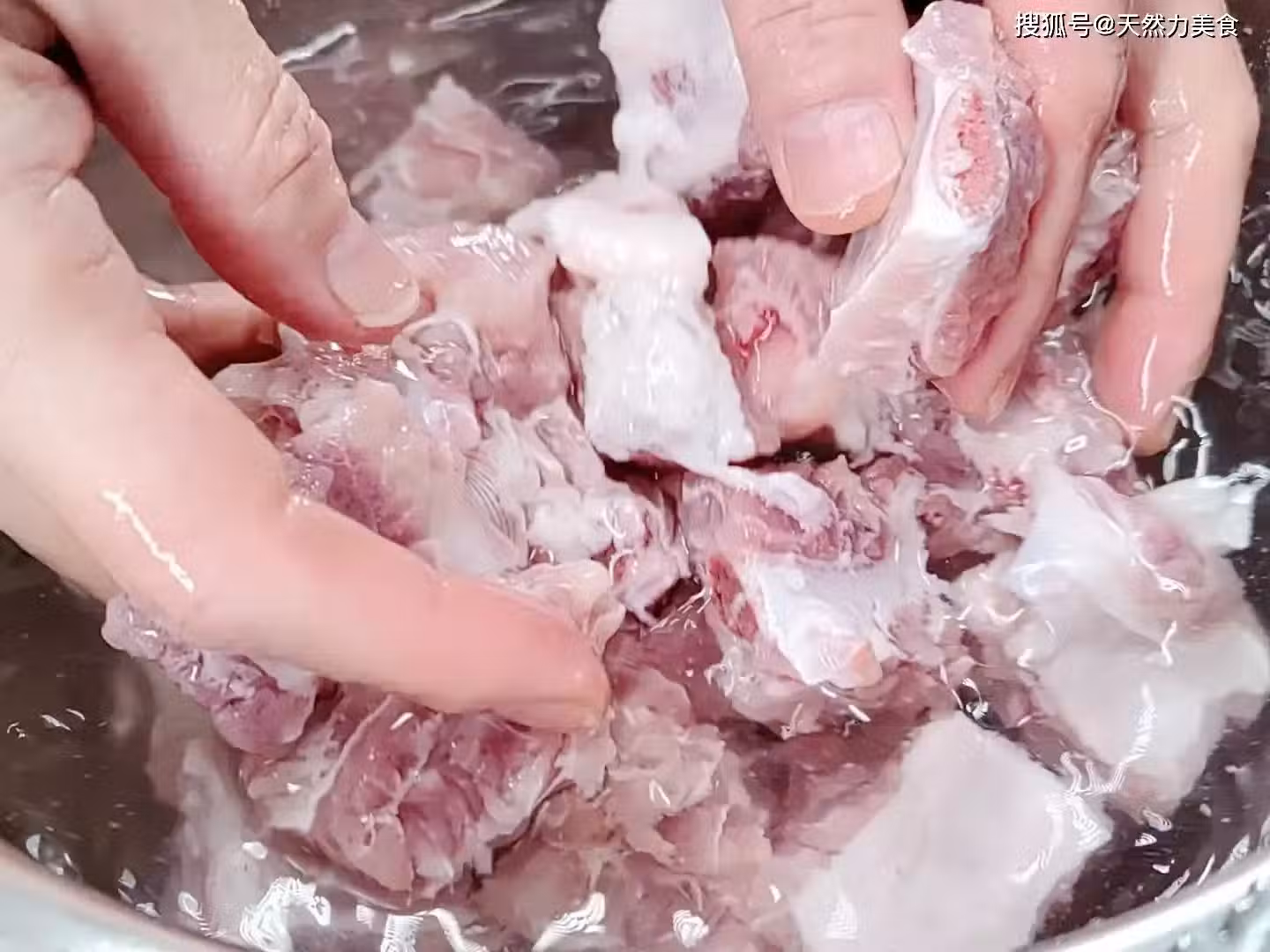 3、接下來要做的也是排骨好吃的另一個關鍵點,那就是要把排骨中的水分擠干,把排骨中的水擠干有兩個目的,第一個是把水分擠干後排骨才能吸收調料的味道,否則排骨沒有空間來吸收味道就會很寡淡,第二個就是擠乾了水分的排骨,在蒸的時候才不會水汪汪的。