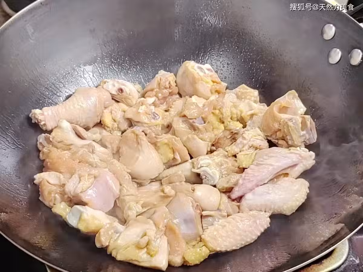 3、雞肉下鍋後全程保持大火,大概煎2分鐘左右,就可以把雞肉的這面煎到有些金黃,這時就可以翻面,雞肉翻面後也是攤開,這樣才能讓所有的雞肉受熱均勻,才會有一樣的煎制效果。同樣的翻面後也是煎2分鐘左右,也是煎到表面金黃就可以了。