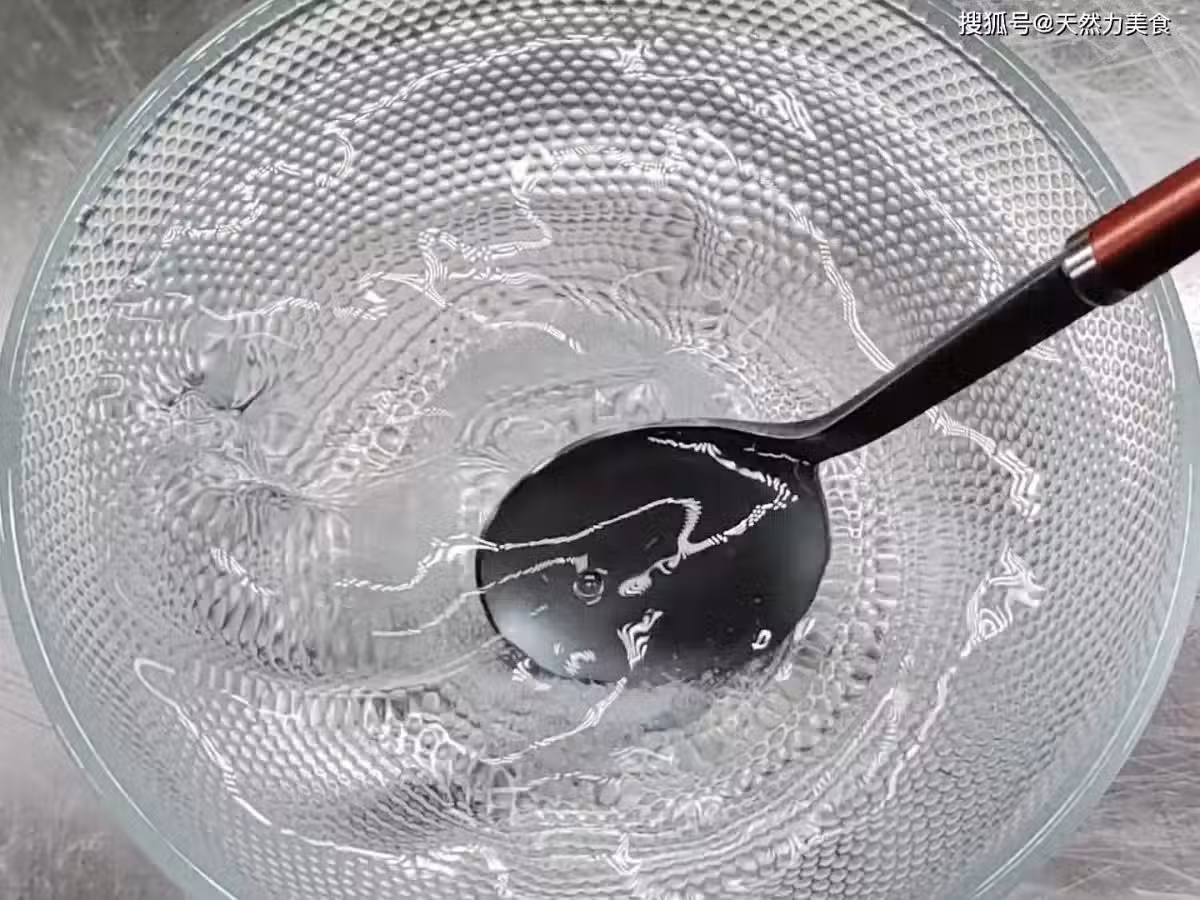 10、把調好味的水倒入打散的蛋液中,先多攪拌幾下,讓蛋液和水充分融合,然後用密漏過濾一下,可以把蛋液中的一些沒打散的筋膜過濾出來,這樣蒸出來的雞蛋羹會更細嫩絲滑。