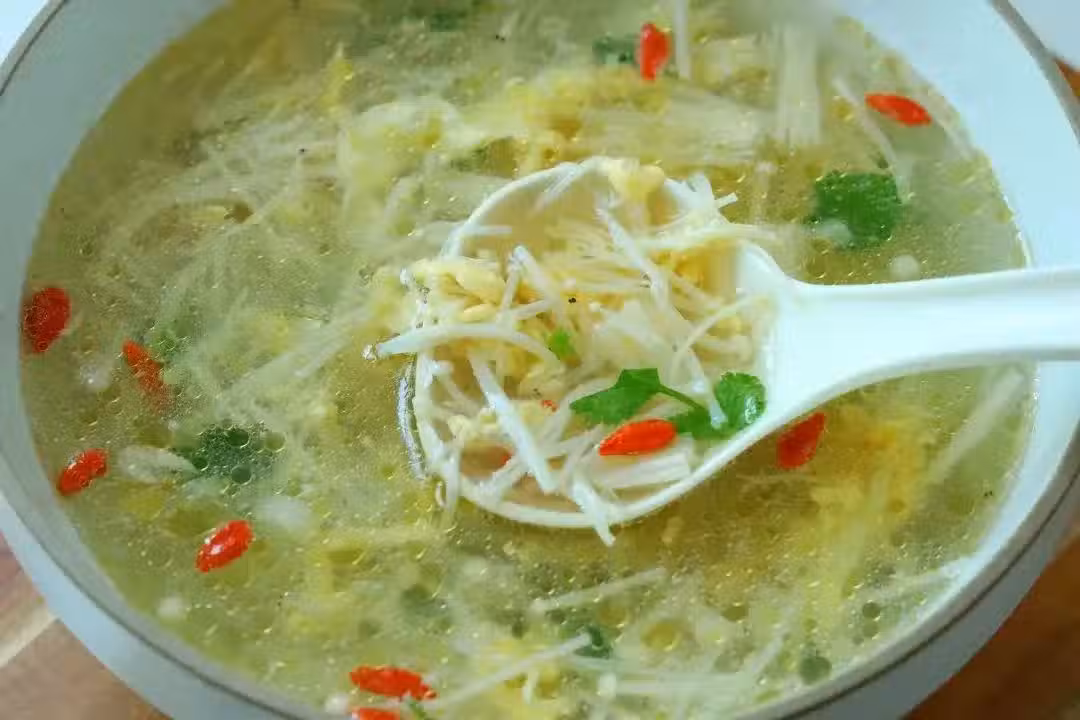 3、加入開水煮開,下金針菇,淋入蛋液;加入鹽和白鬍椒粉煮開攪勻;