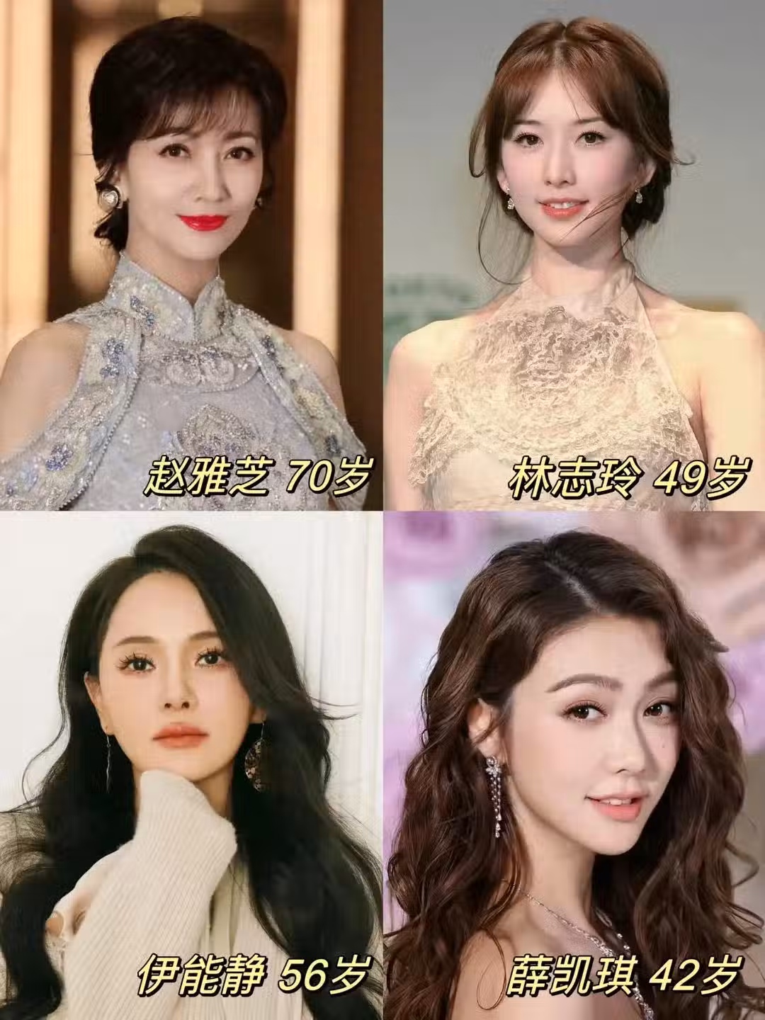 就比如說70歲的趙雅芝、49歲的林志玲、56歲的伊能靜以及42歲的薛凱琪,她們的美麗簡單而輕鬆,仿佛與生俱來。