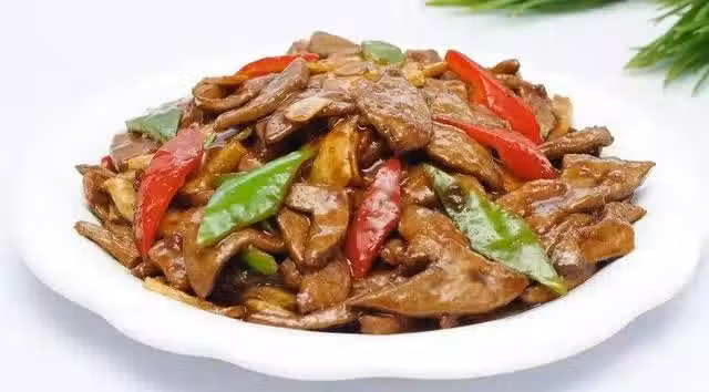 7.加入焯水的豬肝大火翻炒一分鐘,調入適量鹽和味精調味;