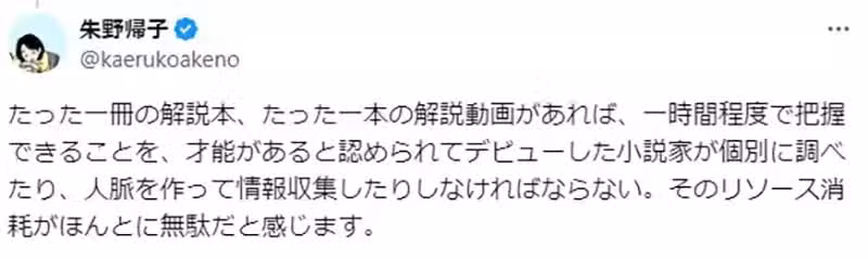 《日本小說家朱野歸子》呼籲同行藉由同人誌分享出書經驗,因為出版業都不喜歡教新人?