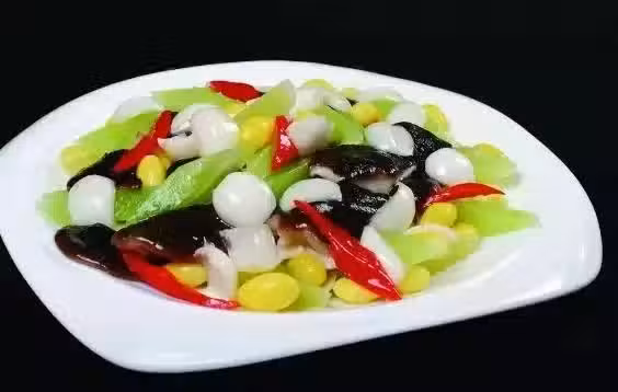 原料:蘆筍、香菇、黃豆、白果、蔥、姜,調料為精鹽、高湯、色拉油、生粉、味精。