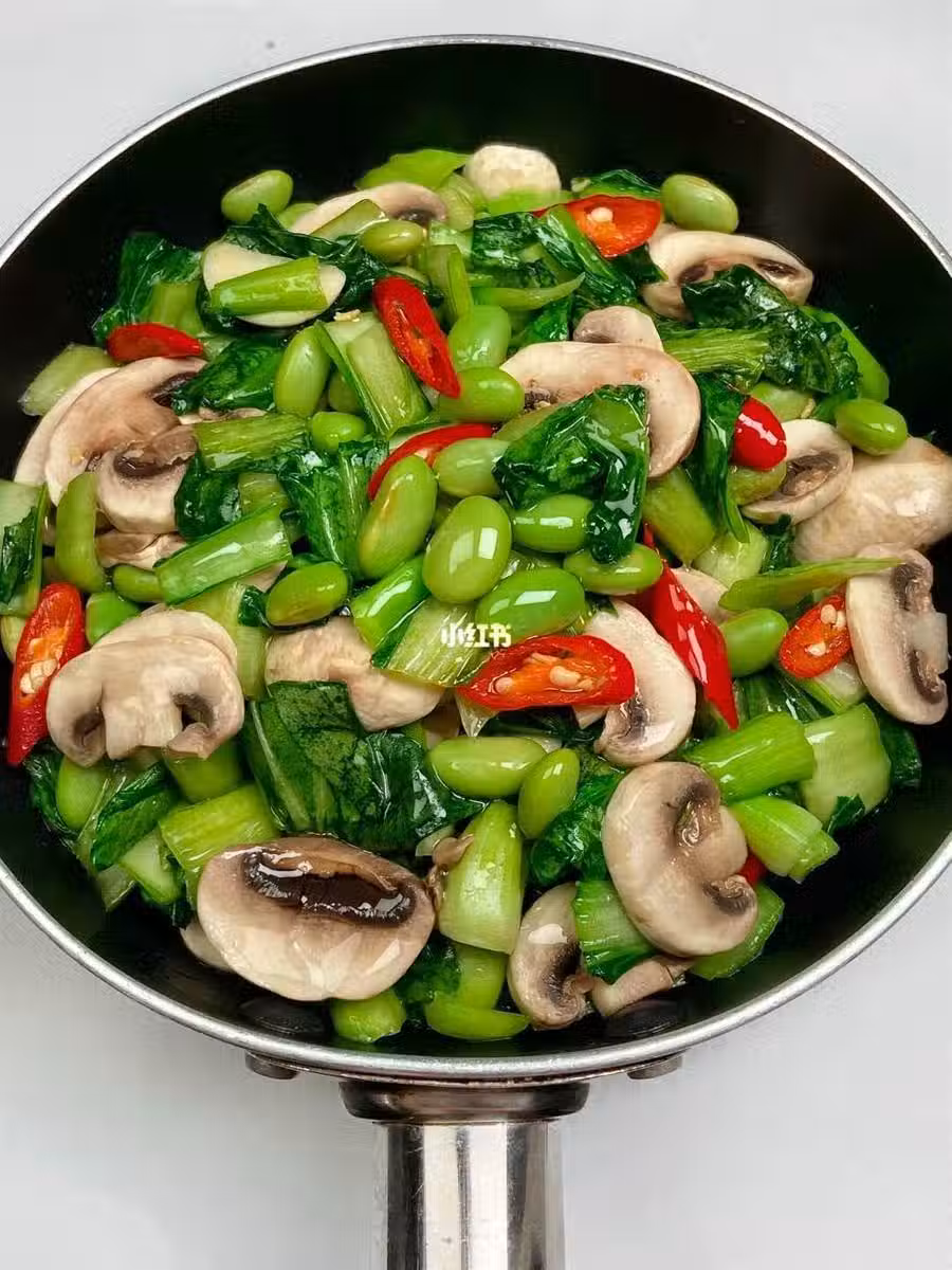這道上海手捏菜以油菜為主,輔以毛豆、口蘑、蒜小米辣等食材。