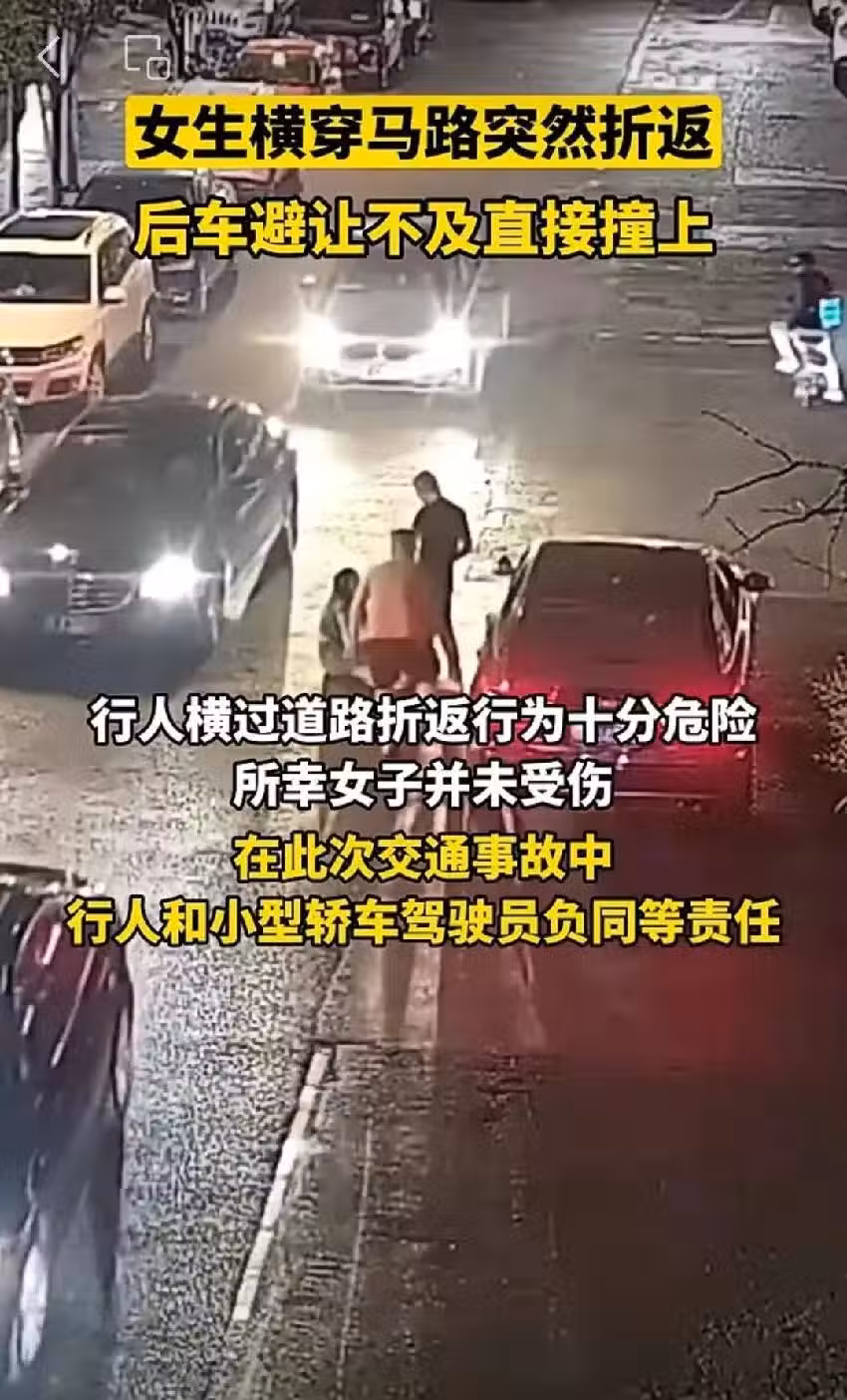 湖北一女子在橫穿馬路時突然折返,下一瞬間,直接和後車發生碰撞!