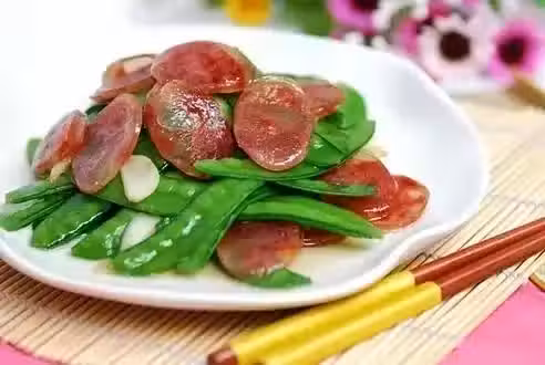 食 材:荷蘭豆250克、臘肉100克、雞粉、少許薑末5克、蒜末10克、油(10克)2茶匙