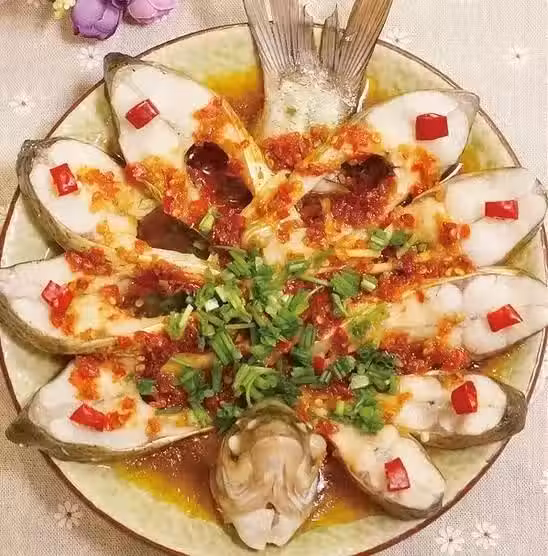 做法:1)魚去鱗、洗凈2)去頭去尾切段,蔥姜切絲,小紅辣椒切片3)魚段加入黃酒腌制10分鐘,將魚段放入盤中,擺成孔雀開屏狀,再擺入魚頭和魚尾,放入薑絲4)起油鍋放入剁椒蒸魚豉油稍微煸炒5)將醬料均勻鋪在魚上,將魚放蒸鍋中,上汽後大火蒸8分鐘左右即可6)取出蒸好的魚,放上蔥末,辣椒圈點綴