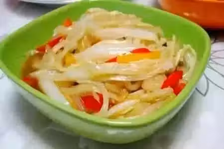 1)白菜幫切絲,青紅椒切絲,蔥姜蒜切好備用