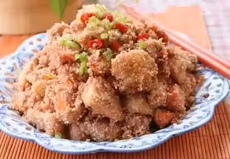 食材:土豆2個、胡蘿蔔1根、南乳汁15ml、郫縣豆瓣10g、橄欖油15ml、糖5g、麻辣味蒸肉米粉100g