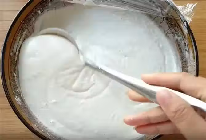 3.然後我們把發好的麵糊稍微攪動一下,排出大氣泡,也可以在晚上把麵糊調好,放冰箱冷藏發酵一晚。