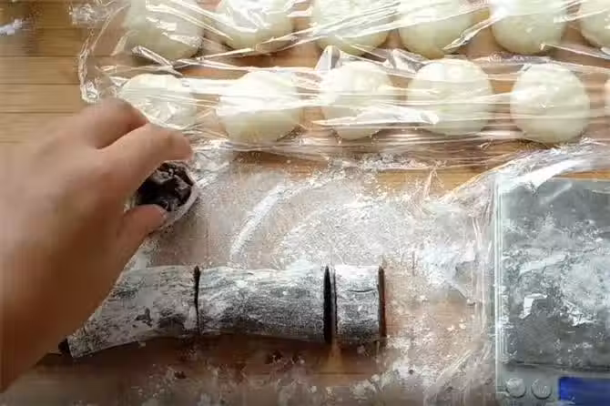 5.接下來我們在案板上撒上一些熟的糯米粉,準備240克的豆沙餡,然後利用糯米粉把豆沙餡搓成長條,下12個面劑,每個面劑的重量約為20克,把豆沙餡搓圓備用,麵皮的重量是30克,豆沙餡的重量是20克,一共是50克,我們選用的月餅模具的重量就是50克。