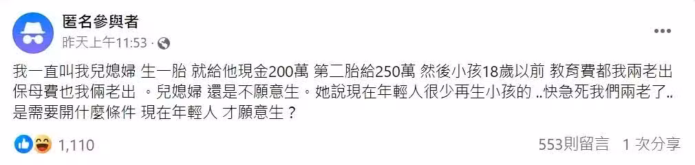 也有網友認為,拿這筆錢去養老更好「遊山玩水不香嗎?每個月捐錢給孤兒院,就多很多孫子、又能助人多好啊!」、「我朋友她公婆說生一胎給百萬,如今小孩一歲,她還是沒拿到錢。」、「我公婆也答應給100萬,結果給了40萬後就...其他什麼都沒有。」