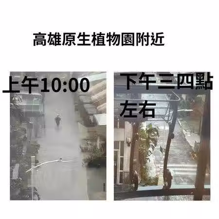 指出,適逢大潮,又遇莫拉克等級的雨量,高雄目前各地人員都在努力排除災害中。感謝各熱心高雄社友提供高雄各地區照片比較。當然可能還有地區辛苦中,但是真的很謝謝值勤中的所有工作人員!他們頂著風雨為大家顧好家園。
