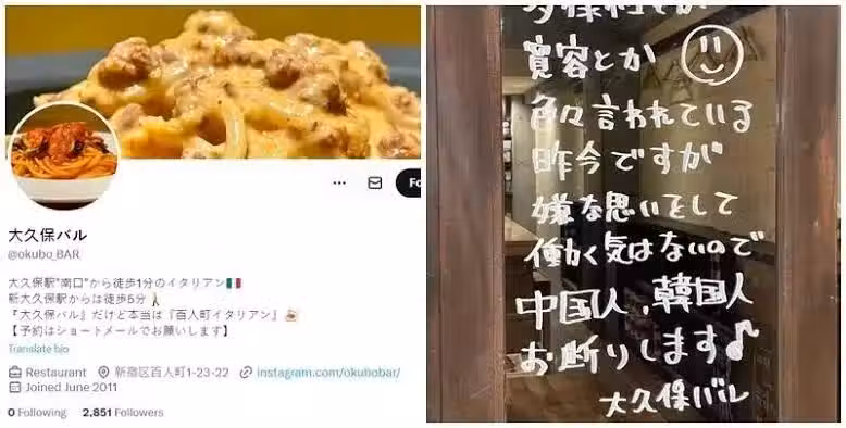 東京新宿大久保有一家餐廳,在7月5日突然貼出公告,用日文寫著「禁止中國人與韓國人入內」在網上引起了公憤,一大批日本網友趕往商家的社交媒體帳號開噴「這是赤裸裸的種族歧視」,「跟你同為日本人,我深感遺憾」「在新大久保歧視外國人,真是不想做生意了」。
