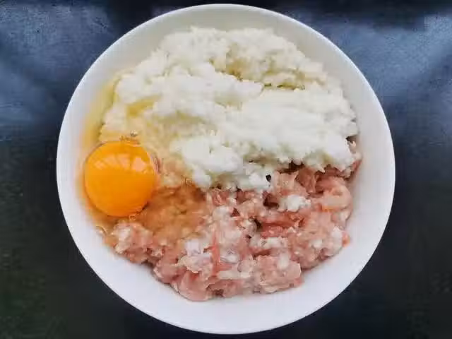 2、將肉餡兒、山藥、雞蛋倒入絞肉機,加入一勺生抽、半勺老抽、一勺胡椒粉、一勺雞精、兩克鹽,30克泡好的蔥姜水,攪打成細膩的肉泥,放入冰箱冷藏半小時,再拿出來加入50克紅薯澱粉順時針攪拌,或者不停地摔打至上勁。