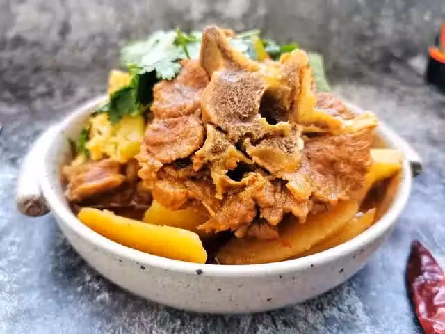 7、等羊蠍子軟爛,倒入土豆塊繼續煮10分鐘左右,再倒入其他好熟的配菜煮5分鐘,根據口味添加適量鹽調味。