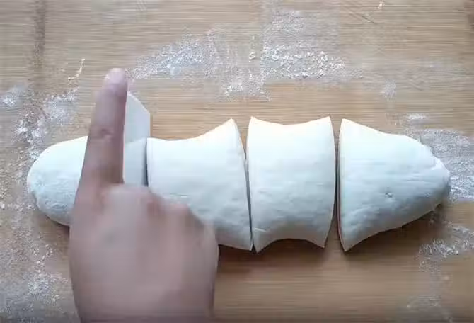 3.在案板上撒上少許的乾麵粉,把發好的面揉搓排氣,大約揉兩分鐘就可以,然後把它搓成長條,下3到4個面劑,當然你可以做的更大一些,兩個也可以。