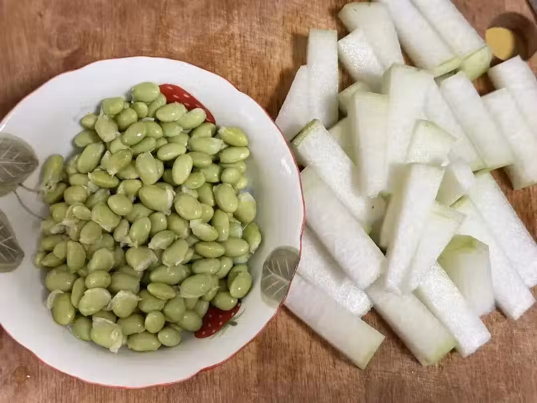 2、熱鍋涼油,下入蒜片炒香,再加入豆米翻炒至變色;再把冬瓜加進去一起翻炒。