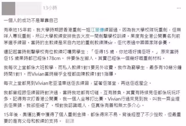 據指每次上擊劍課多為大班教學,該網民大爆江旻憓的才華很早就受到重視,因而獲「特別照顧」,表示:「私人教練一對一要另外收費,我作為窮學生,最多有10幾分鐘時間一對一。而Vivian當時幾乎全程都由陳教練一對一指導,每次上課都見到Vivian爸爸開車送她來練習,看著她下課,再送她回家。」大爆江旻憓父女的溫馨相處細節。