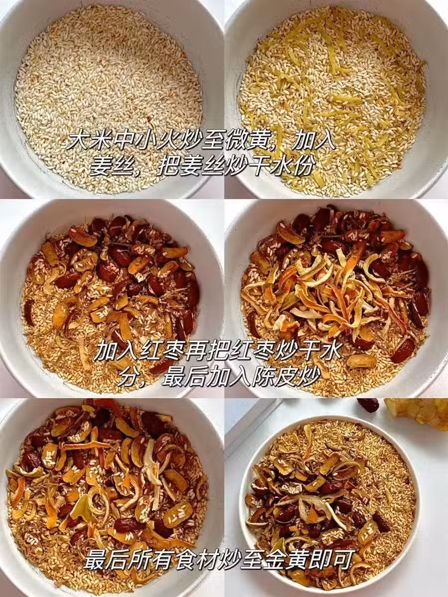 大米洗一下更乾淨,不需要控干水分,小火炒到微微發黃。加入薑絲,全程小火炒大概5分鐘。依次加入紅棗、陳皮炒到金黃色就可以了。