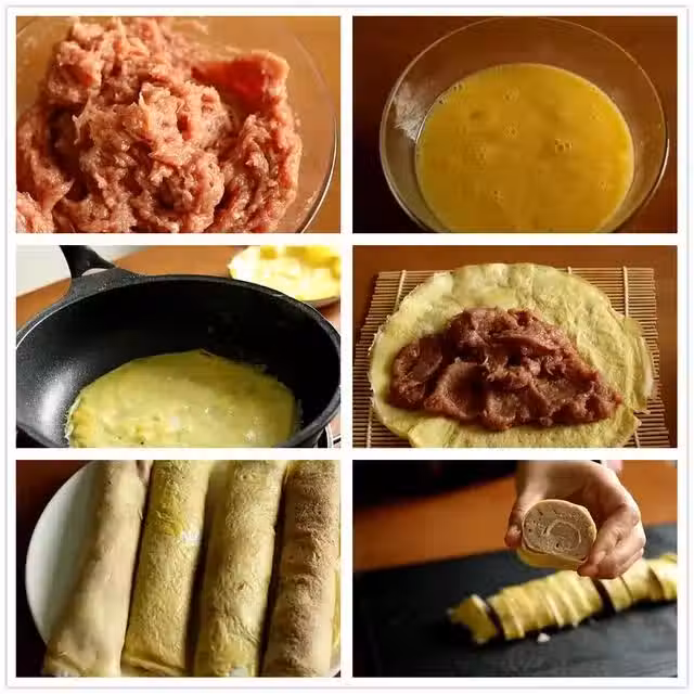 6、把晾涼的蛋餅鋪平,上面均勻地鋪上一層肉餡,邊緣塗上一層蛋液方便粘合,從下往上把蛋餅從下向上捲起來,卷緊不留空隙。