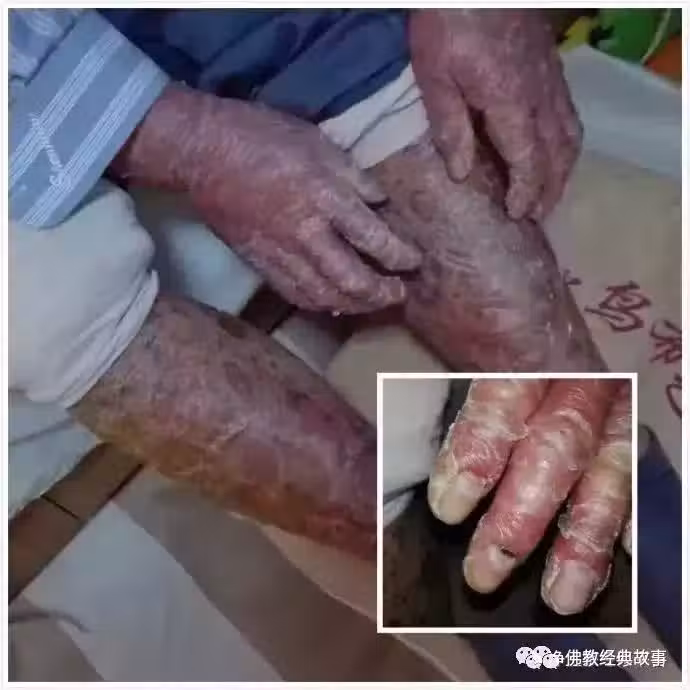 在走投無路時,今年七月份,他在老伴和女兒的攙扶陪伴下,來到「彌陀之家」,每天跟大眾共修念佛、學習。記得當時看到他時,全身無一處是健康的皮膚,從頭到腳都是白花花的皮屑,不停地脫落。聽說他家裡的床上、地上到處都是他脫落的皮屑,一天下來能掃出兩大捧。他全身腫脹,如同剛在油鍋里炸過似的,體溫一直持續在38°-42°之間,後來已無法行走,在病苦的折磨下,每天都是生不如死,只能睡1-2個小時的覺。
