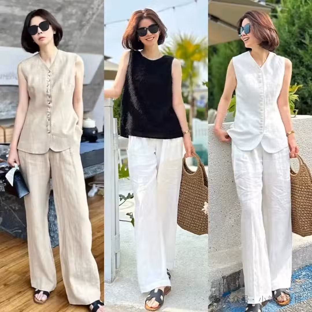 淺卡其色的亞麻馬甲,選擇同色系來進行搭配一,單一的淺色系搭配有種「老錢風」的感覺,將高級感拉滿。