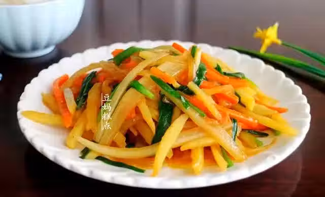 2、鍋里燒熱油,放入土豆條翻炒兩分鐘;然後倒入白蘿蔔條、胡蘿蔔條一起翻炒均勻。