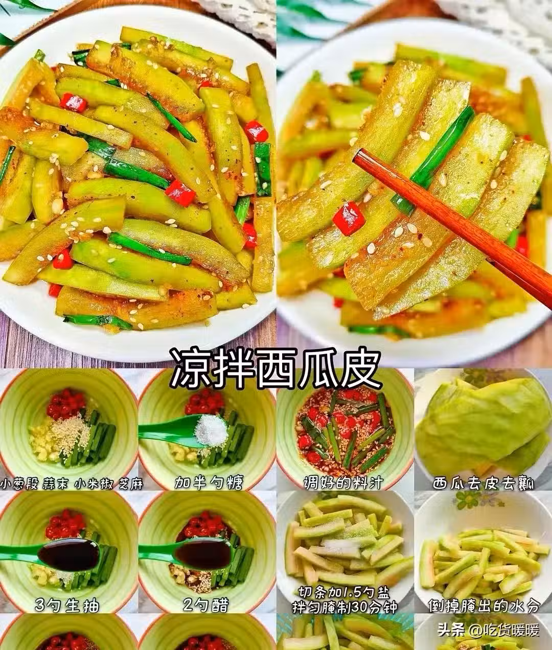 小蔥段 蒜末 小米椒芝麻 加半勺糖 調好的料汁 西瓜去皮去瓤 切條加1.5勺鹽3勺生抽 2勺醋 拌勻腌制30分鐘 倒掉腌出的水分 清水沖洗兩遍小