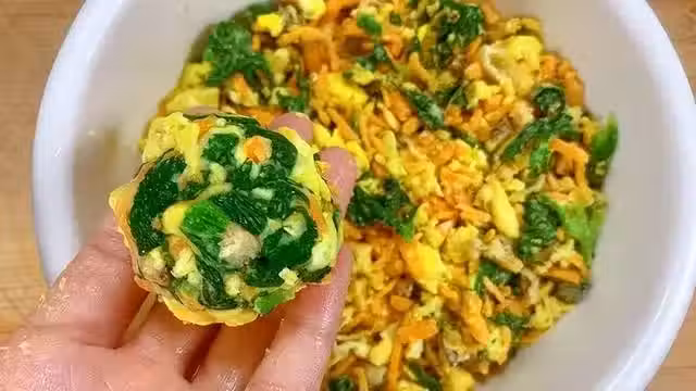 4、蒸製菜糰子:在蒸鍋里放上屜布(或者刷點油防粘),將攪拌好的芹菜葉玉米面糊用手或勺子捏成小糰子,逐個放入蒸鍋。大火蒸大約15分鐘,直到菜糰子表面變得光滑且有彈性,即可出鍋。
