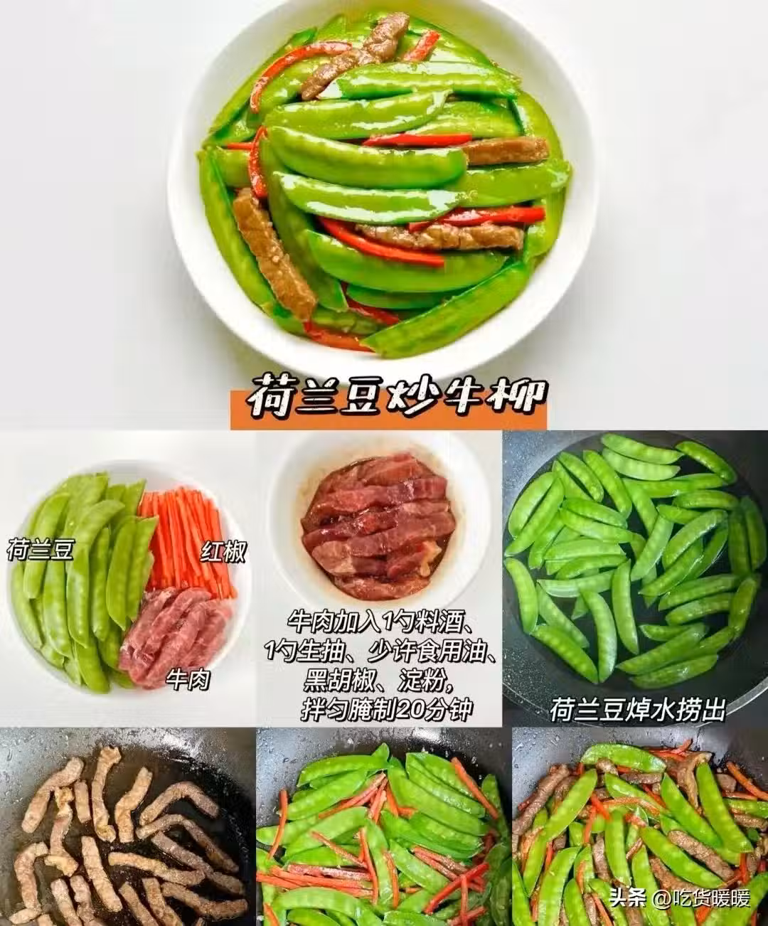 荷蘭豆 紅椒牛肉加入1勺料酒、1勺生抽、少許食用油、牛肉 黑胡椒、澱粉,拌勻腌制20分鐘 荷蘭豆焯水撈出熱油炒香 ,倒入加紅偉 特油熱油炒熟牛肉盛出 荷蘭豆和紅椒翻炒 翻炒,再倒入牛柳翻炒。