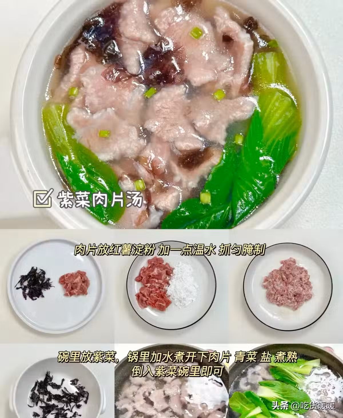肉片放紅薯澱粉加一點溫水抓勻腌制碗里放紫菜,鍋里加水煮開下肉片青菜鹽煮熟倒入紫菜碗里即可。