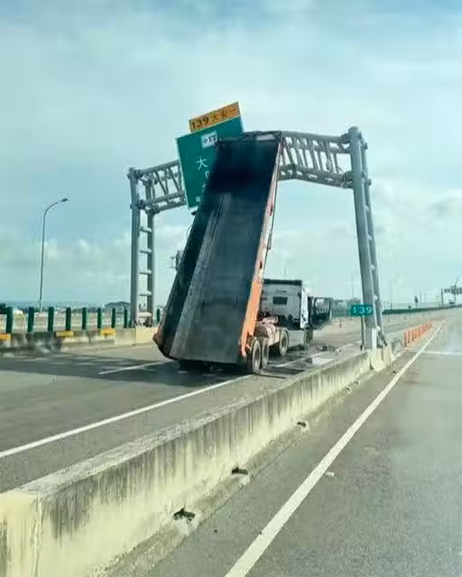 台中市16日下午發生一起頗為驚險的工安事故,一輛砂石車仿佛「天降神兵」一樣直接撞上數米高的路標。