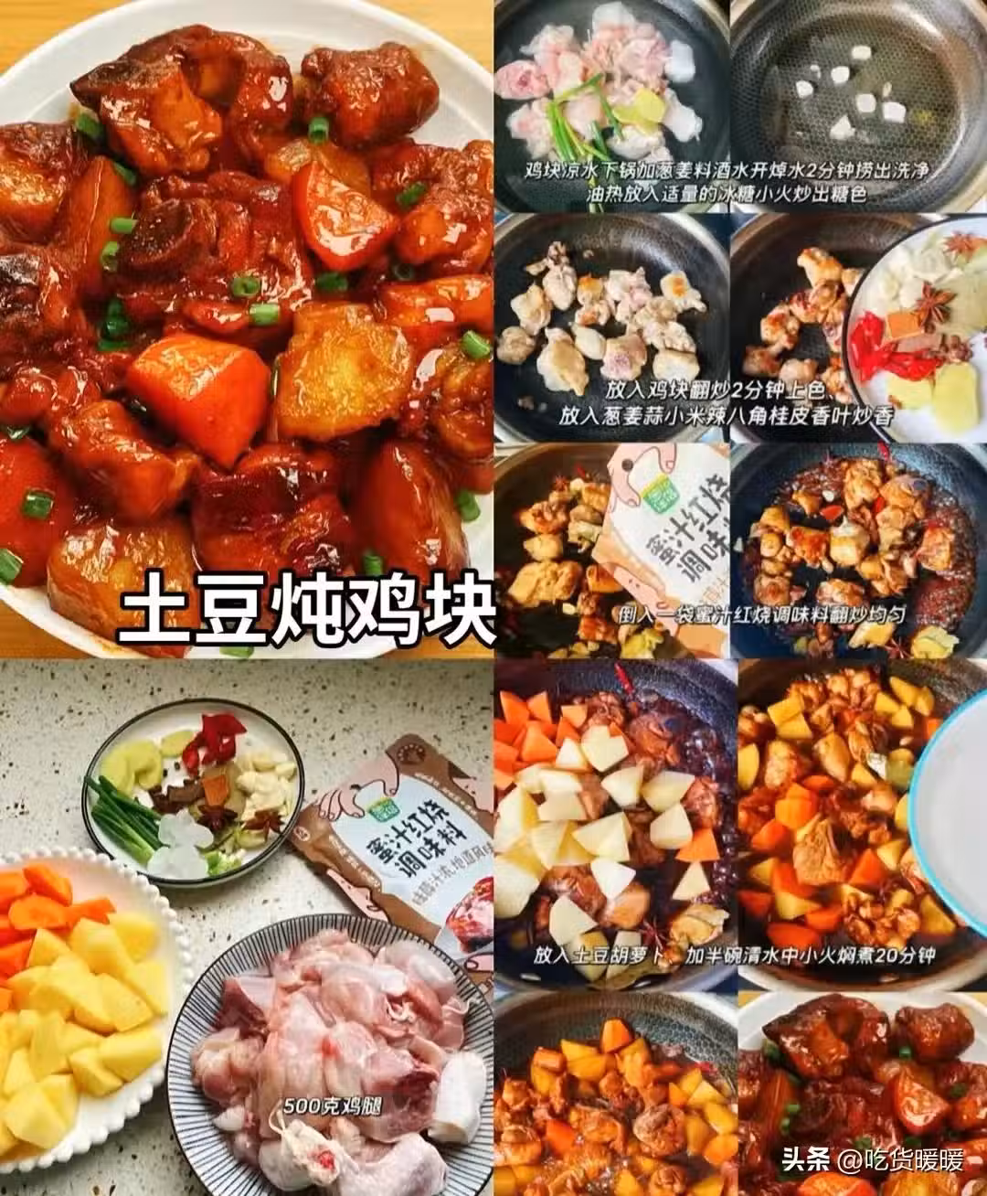 雞塊涼水下鍋加蔥姜料酒水開焯水2分鐘撈出洗凈油熱放入適量的冰糖小火炒出糖色放入雞塊翻炒2分鐘上色放入蔥姜蒜小米辣八角桂皮香葉炒香土豆燉雞塊倒入一袋蜜汁紅燒調味料翻炒均勻調味料汁濃地道風放入土豆胡蘿蔔 加半碗清水中小火燜煮20分鐘 500克雞腿準備食材。