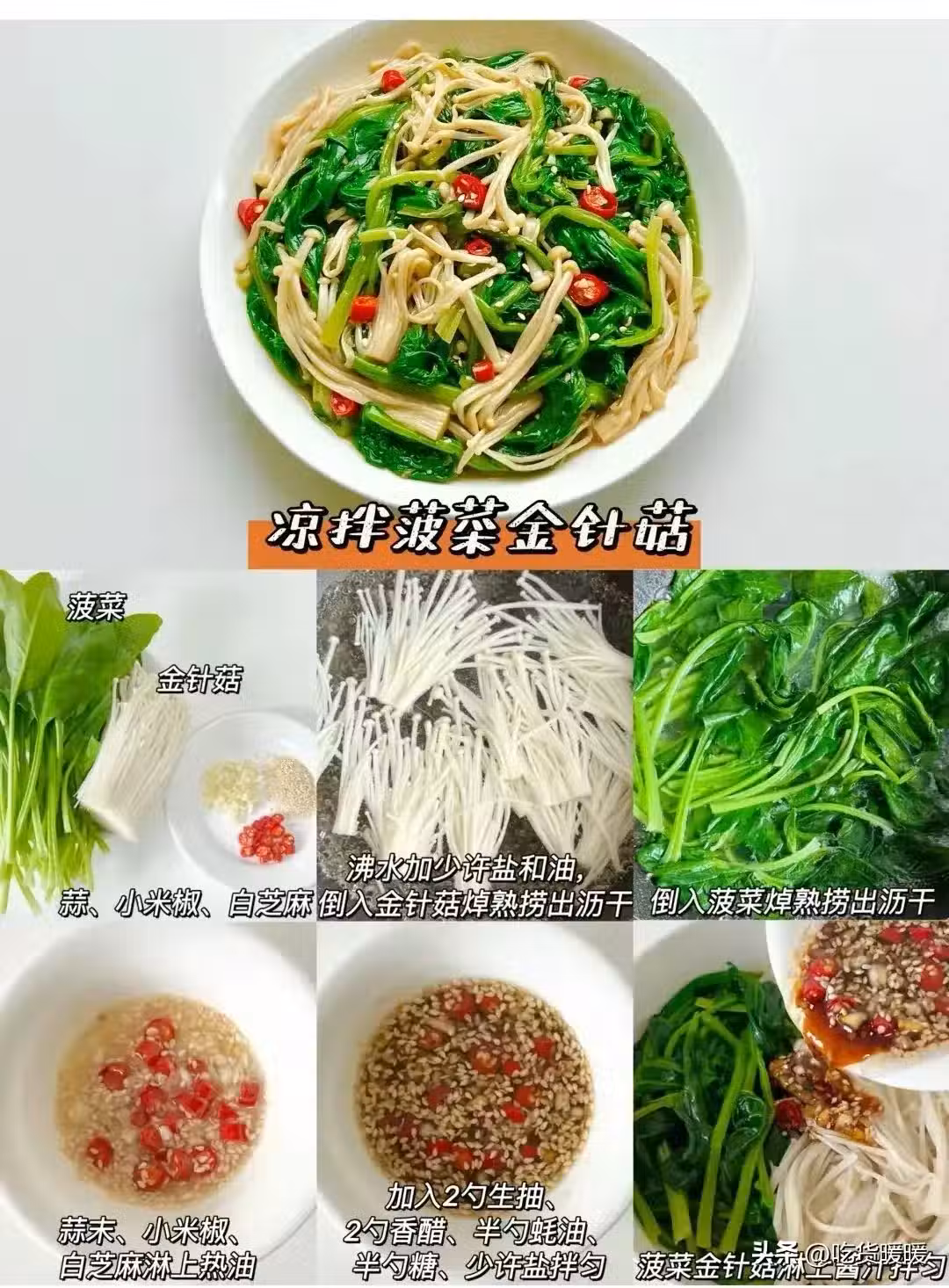 白芝麻淋上熱油 半勺糖、少許鹽拌勻菠菜金針菇淋上醬汁拌勻