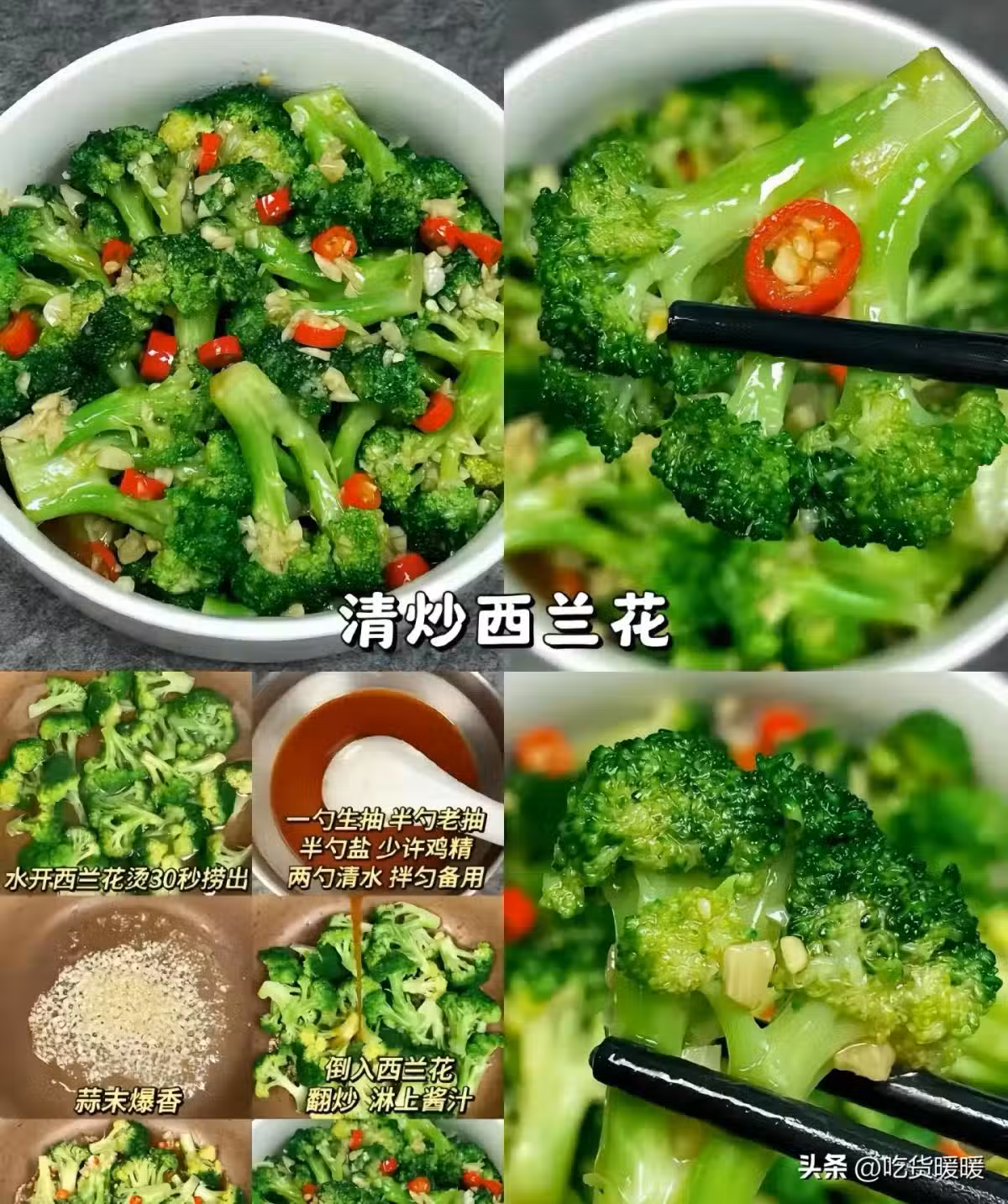 一勺生抽、半勺老抽、半勺鹽,少許雞精水開西蘭花燙30秒撈出 。兩勺清水 拌勻備用。倒入西蘭花,蒜末爆香 ,翻炒淋上醬汁。