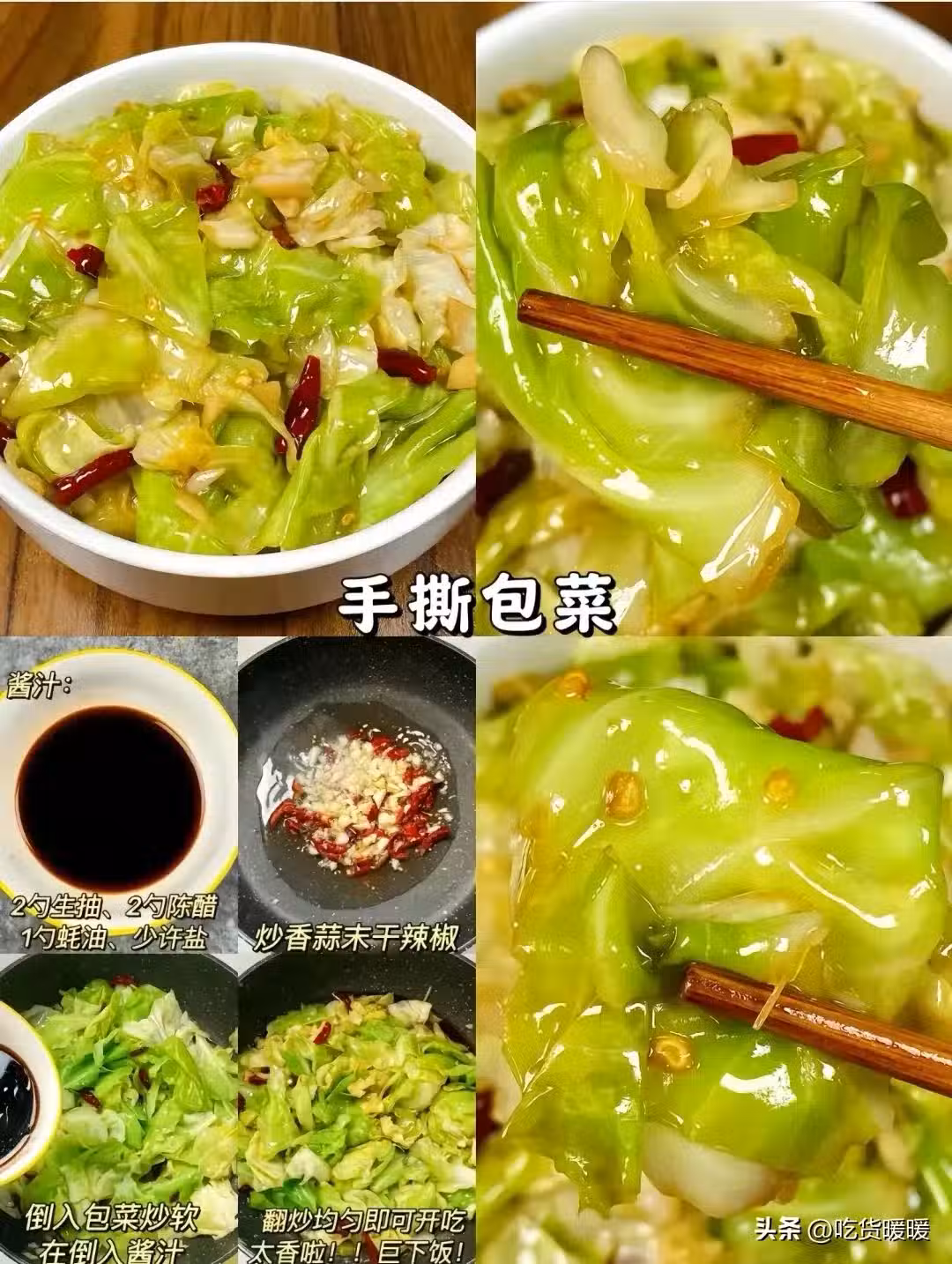 2勺生抽、2勺陳醋1勺蚝油、少許鹽 炒香蒜末干辣椒,倒入包菜炒軟, 翻炒均勻即可開吃。在倒入醬汁 ,太香啦!!巨下飯!