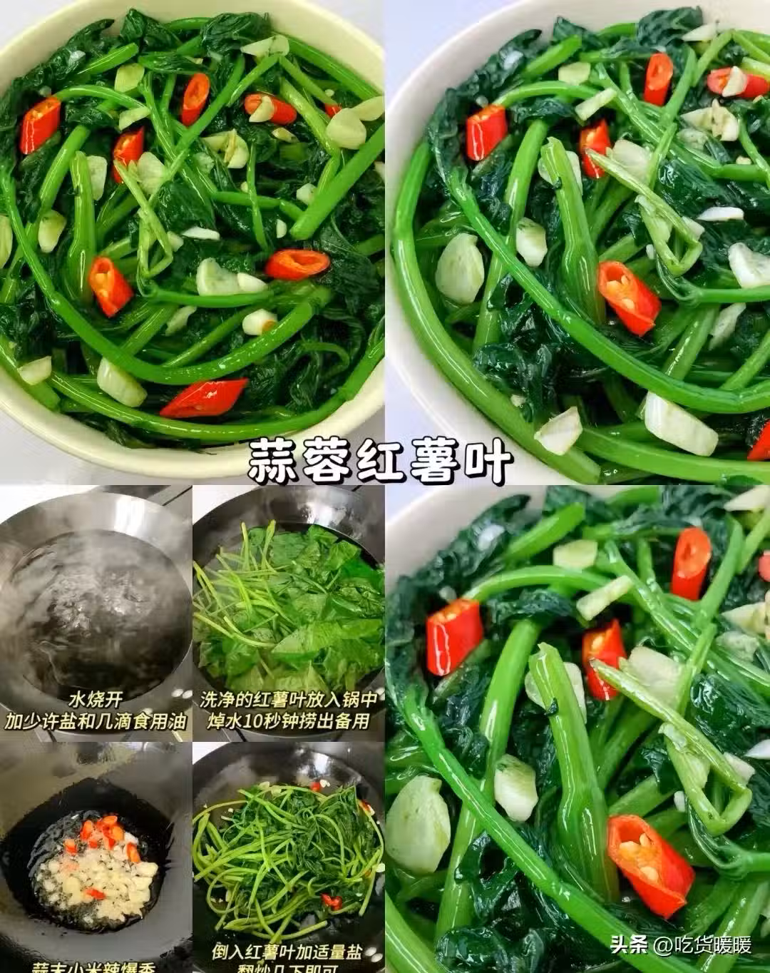 水燒開 ,洗凈的紅薯葉放入鍋中 。加少許鹽和幾滴食用油焯水10秒鐘撈出備用。蒜末小米辣爆香翻炒幾下即可倒入紅薯葉加適量鹽。