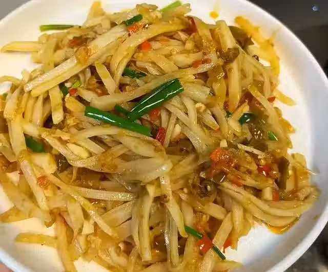 2、油熱放蒜末、泡椒碎、泡姜碎炒香,倒入藕絲翻炒1分鐘