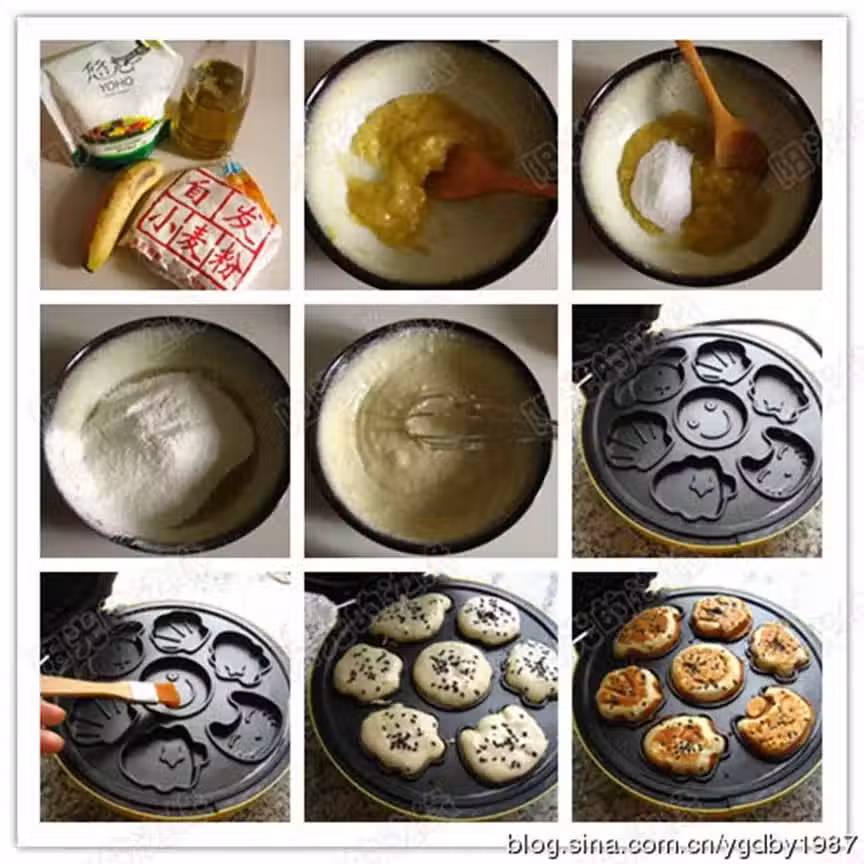 -材料:低筋自發粉50g,水50g,香蕉50g,果糖8g,玉米油8g。(這些量可以做8個) -做法:1、香蕉碾成泥,細不細膩的都可以,倒入果糖和水攪勻。 2、篩入麵粉攪勻,再加油攪勻。 3、預熱蛋糕機,加熱燈熄滅時打開蓋子,刷一層油,舀入麵糊,可以撒點芝麻什麼的。 4、蓋上蓋子,等大概3分鐘,加熱燈再次熄滅,蛋糕就烤好了。
