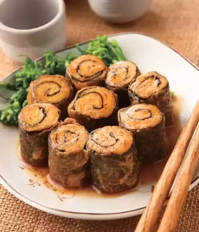2.將作法1的材料放至腐皮上後捲起,於尾端塗上少許麵糊後卷緊,再放入蒸鍋中蒸約5分鐘,取出放涼後切段,放入油鍋中炸約1分鐘至表面呈現金黃色後撈起瀝油,即為素鰻魚備用。