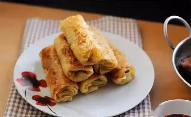 4、平底鍋刷一點點油,排入包好的春卷大火煎(用油煎而不是油炸,才能保證不散架)。