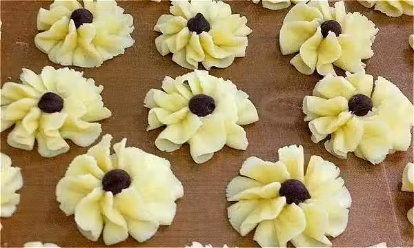 把牛油和糖粉打至顏色變淺,篩入粉類。 用888花嘴,放入(1),用拇指擠在鋪了紙的烤盤,用巧克力豆裝飾,即可。 放進預熱烤箱,170度15分鐘。
