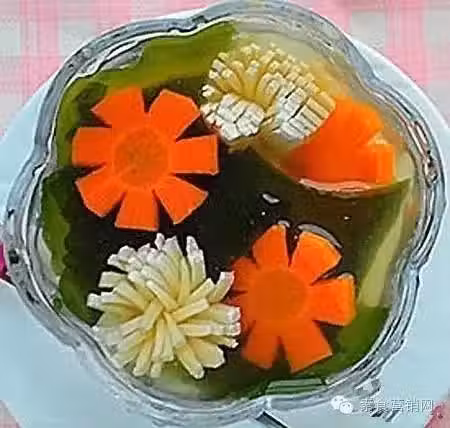 1、把豆腐切橫豎刀,最後面要連著一點不能切斷;胡蘿蔔先切片後切花;海帶芽取適量清水泡開。